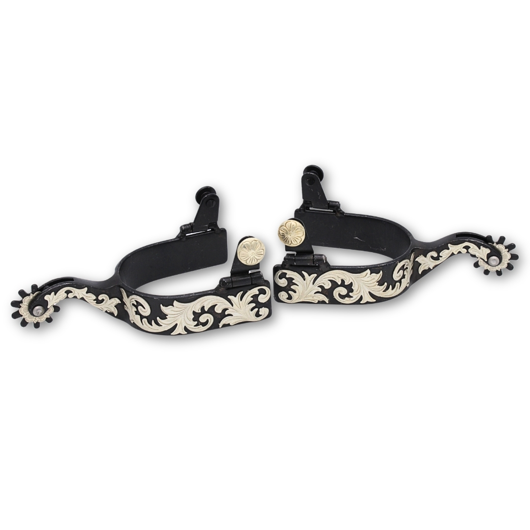 Schwarze Westernsporen mit graviertem Overlay auf Sporen und Rädchen, Rädchensporen