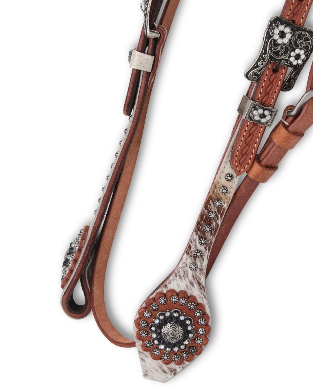 - Design-Highlight: Auffällig geformtes Backenstück verziert mit echtem Cowhide (Echthaar)-Besatz in Weiß-Braun und großen, funkelnden Silber-Conchos mit Strasssteinen. Das Echthaar-Overlay macht jedes Kopfstück zu einem unverwechselbaren Einzelstück, da die Haarstruktur individuell variiert.